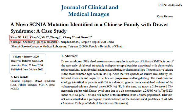 2020年6月26日,我院詹伟华院长为第一作者,李江波主任为第二作者的有关癫痫基因精准医疗的学术论文《A Novo SCN1A Mutation Identified in a Chinese Family with Dravet Syndrome: A Case Study》(《一个中国Dravet综合征家系中新发SCN1A基因突变的病例研究 》),荣登美国医学SCI《Journal of Clinical and Medical Images》(《临床与医学影像杂志》)核心期刊第九期。论文首次报道了SCN1A基因(c.2856G>A, p.Trp952X) 在儿童Dravet综合征的诊断意义,此论点基因通过查询ACMG被确定为在中国人群的首创报道,引起医疗学术界热议。这标志我院在癫痫病精准医疗方面与国际接轨,在癫痫医学研究领域迈上崭新台阶。